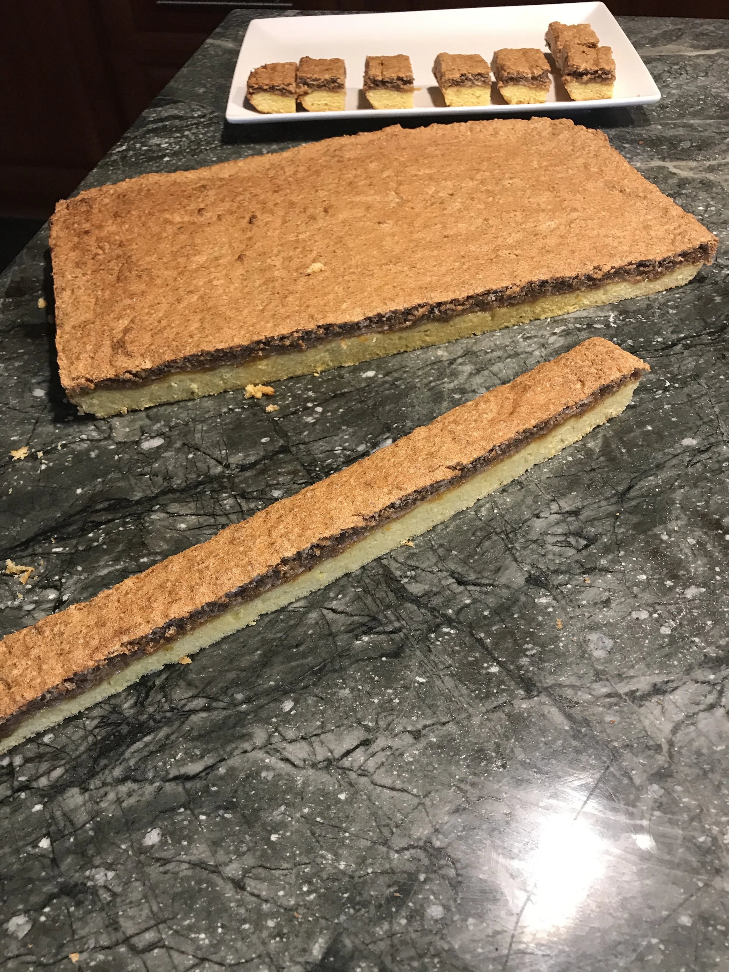 Three layered shortbred squares topped with apricot jam and walnut foam.